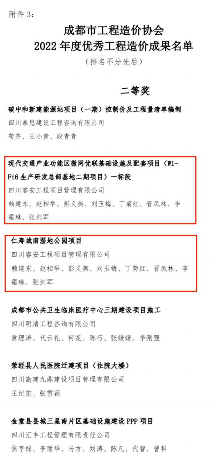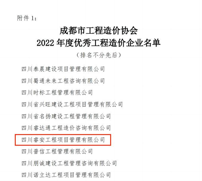 近日,为表彰从事工程造价工作,并做出优异成绩的企业、从业人员、取得的优秀成果,促进成都市工程造价行业的健康发展,成都市工程造价协会开展2022年度优秀工程造价企业、优秀工程造价从业人员、优秀工程造价成果的评选活动。睿安项管凭借其专业的技术能力及全面的服务理念,通过“企业申报、专家评审、综合评估”等层层审核筛选,成功入选“2022年度优秀工程造价企业、优秀工程造价从业人员、优秀工程造价成果”名单榜!